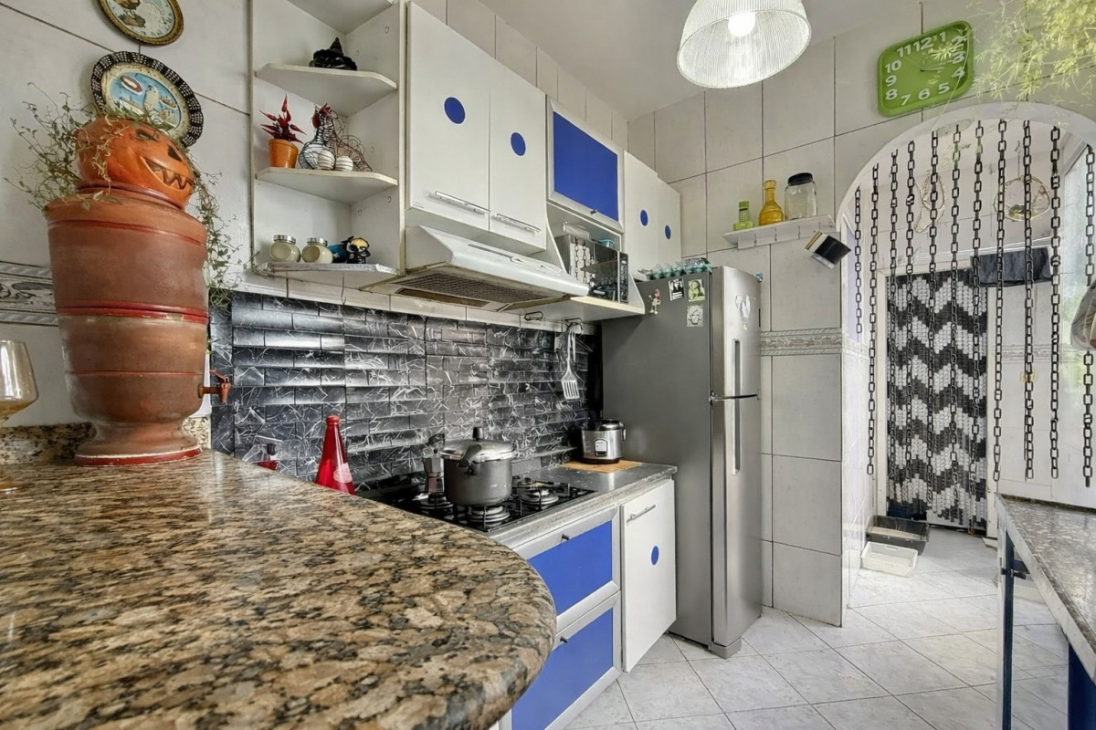 Cozinha equipada com armários planejados, cooktop, coifa e piso em cerâmica.