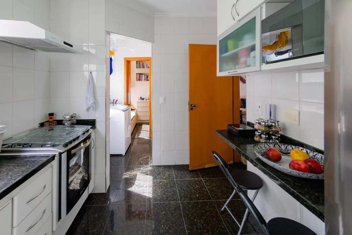 Cozinha ampla e montada, com armários planejados e bancadas em granito, permanecendo fogão e exaustor.