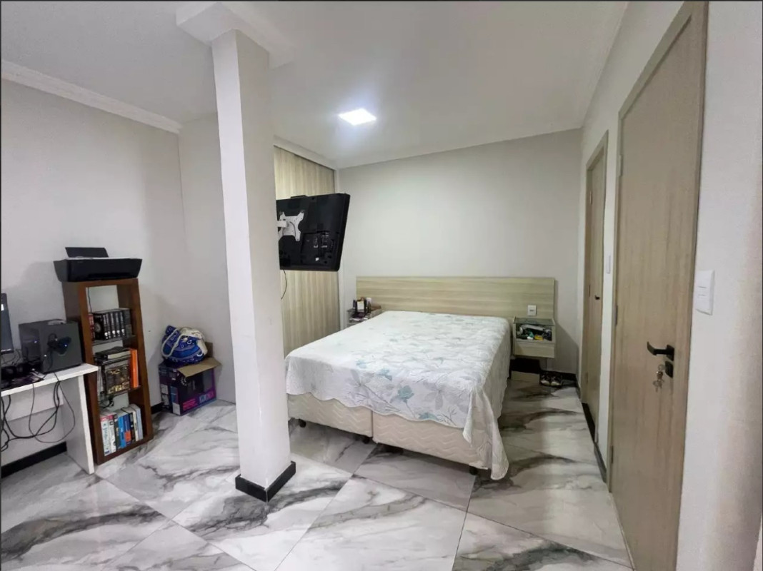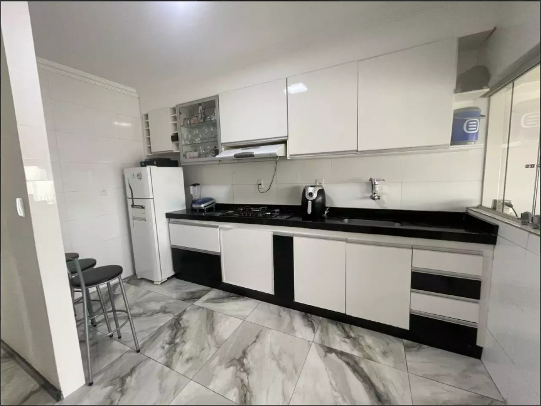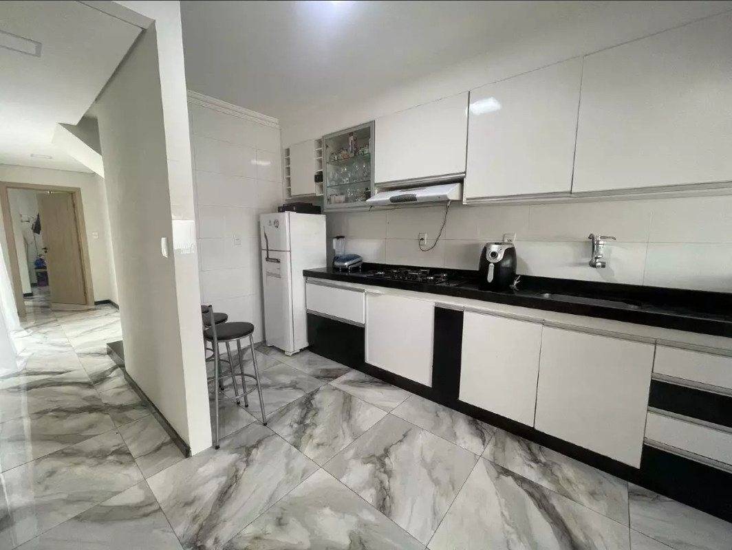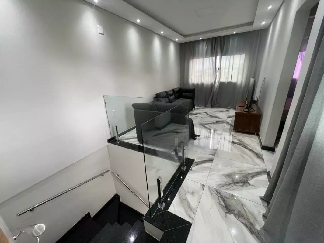 Excelente padrão de acabamento, com pisos em porcelanato, teto rebaixado em gesso com iluminação embutida, bancadas em granito nos banheiros, cozinha, área de serviço e área gourmet. A escada é revestida em granito e conta com corrimão em inox. Banheiros equipados com box em blindex.